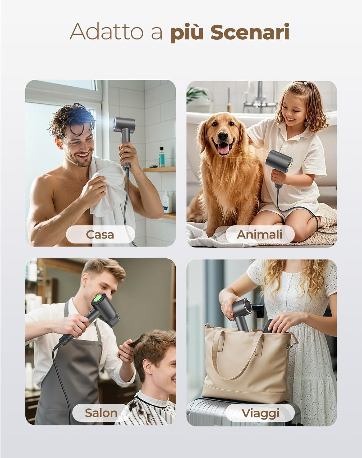 - Silenzioso <59 dB, Potenza Senza Disturbo: Grazie alla tecnologia di riduzione del rumore, puoi asciugarti i capelli anche la mattina presto o mentre il bambino dorme. Fai sentire speciali i tuoi cari con un phon capelli ionico veloce e delicato – il regalo perfetto per ogni giorno.